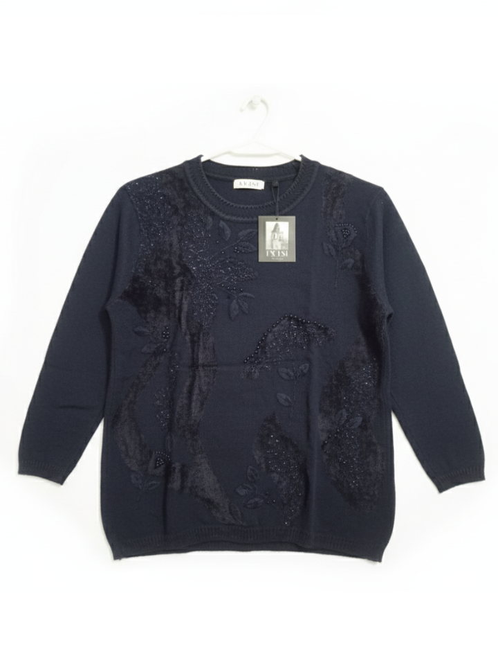 L Size Women's Embellished Navy Sweater with Velvet & Beading