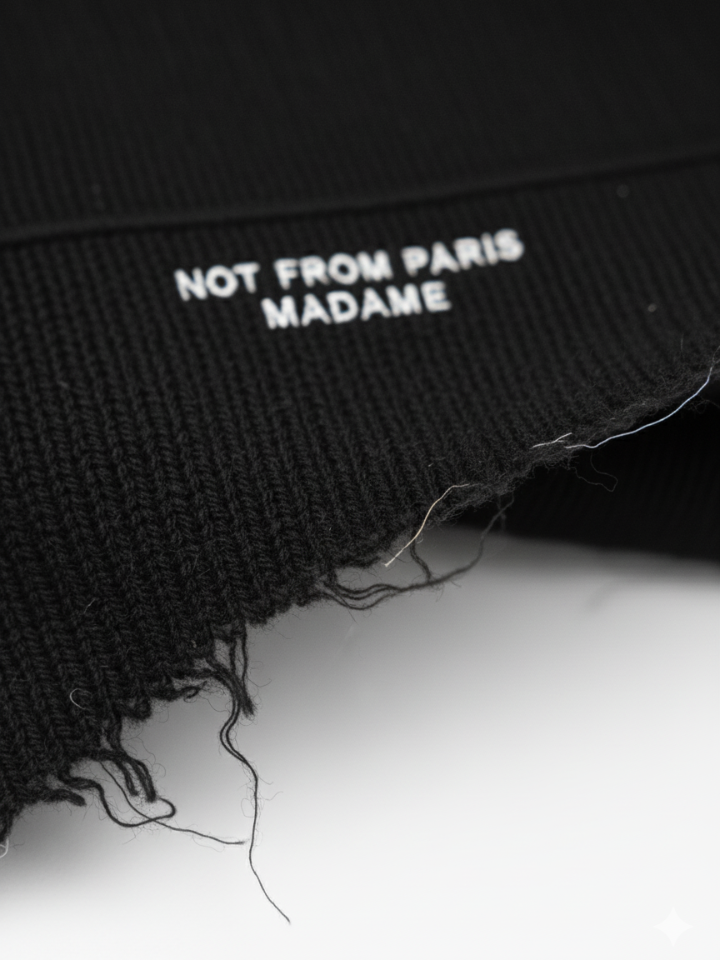 - Minimalist Statement: The subtle white embroidered text, “NOT FROM PARIS MADAME,” adds a unique, high-fashion touch without being overpowering.
