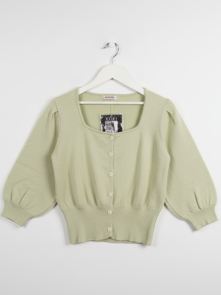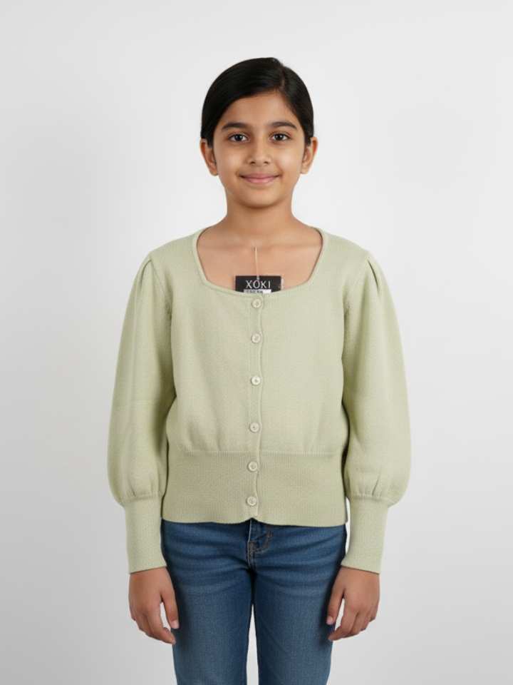 Introduce a touch of timeless charm to her wardrobe with our adorable Square Neck Cardigan! Perfectly sized for girls aged 9-10 years, this light green sweater is a versatile and stylish addition for any season.