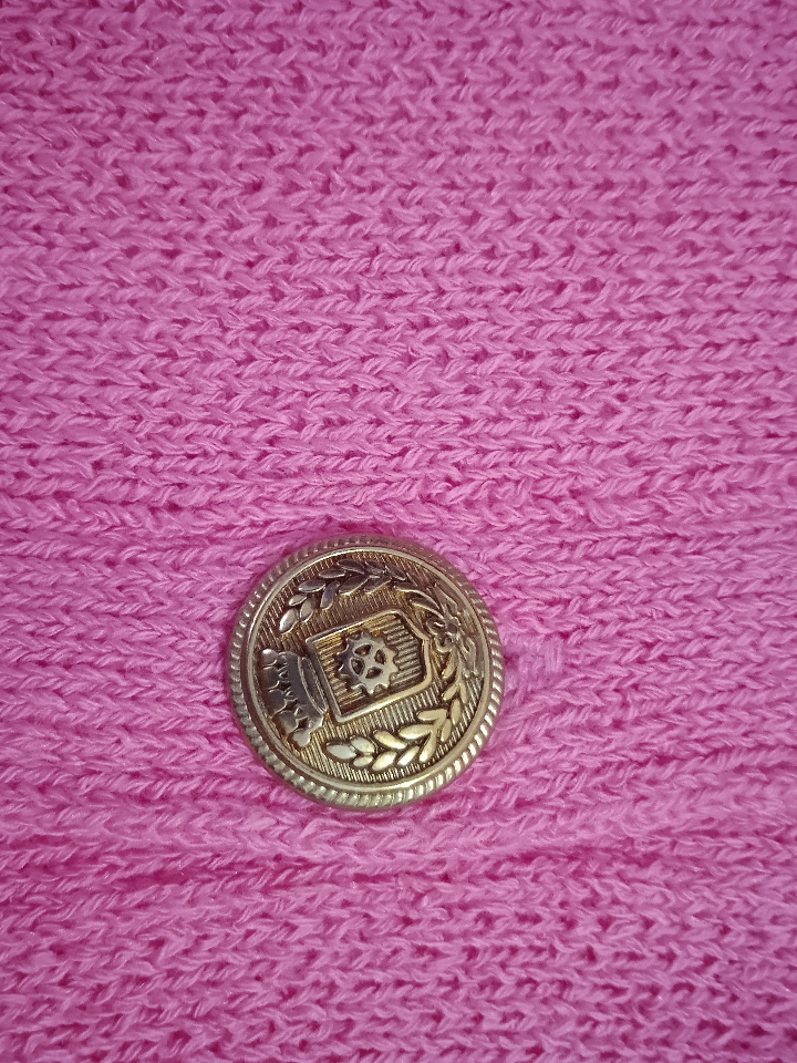 Add a touch of elegance and warmth to your wardrobe with this lovely L-sized pink knit cardigan. Its rich texture, sophisticated gold-tone buttons, and practical front pockets make it a versatile piece for any season. Perfect for layering, this cardigan brings a pop of color and classic style to both casual and dressier ensembles.