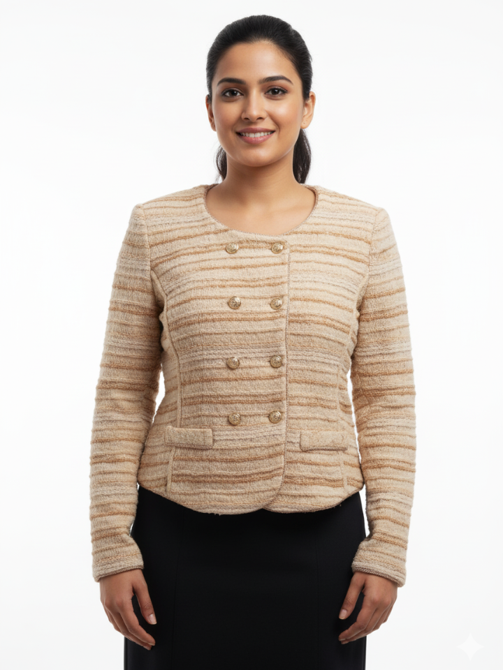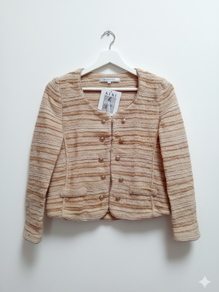 Discover your new favorite layering piece for the season with this gorgeous KUKI textured knit cardigan, available in size S. Crafted with a unique, horizontally ribbed texture in a beautiful blend of beige and cream hues, this top offers both warmth and undeniable style. The distinctive round neckline and a row of ornate gold-tone buttons add a touch of vintage charm and sophistication. Designed for comfort and versatility, it’s perfect for transitioning from office chic to an elegant evening out.