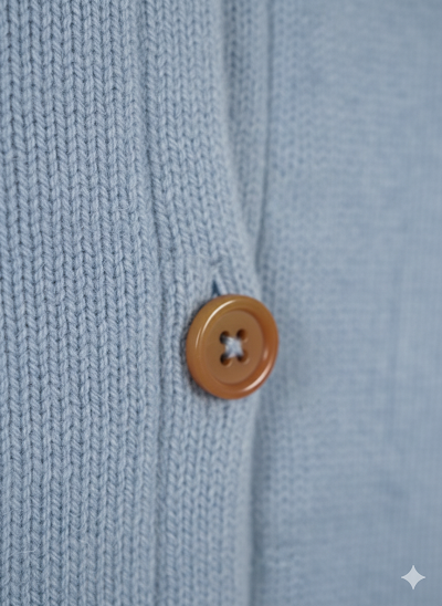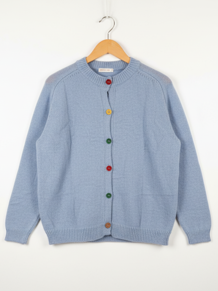 - Unique Detail: Features a delightful row of five vibrant, mismatched buttons (e.g., Red, Yellow, Green) that add a charming, playful pop of color to the soft blue knit.