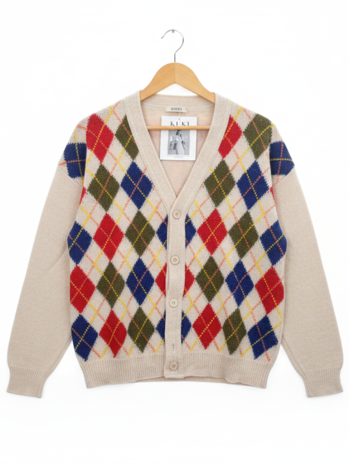 Discover the perfect blend of vintage charm and modern comfort with our stunning argyle knit cardigan. This isn’t just a sweater; it’s a statement piece designed to add a pop of sophisticated color to your wardrobe. The intricate diamond pattern in vibrant red, deep blue, forest green, and sunny yellow stands out beautifully against the warm, natural-toned background.