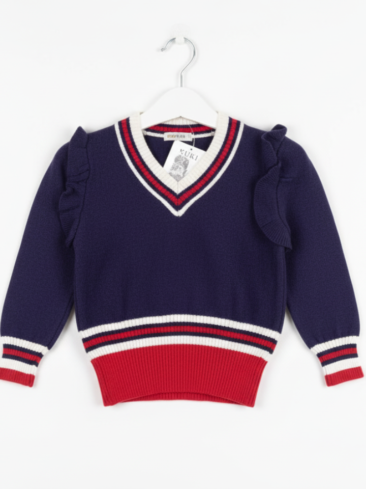 - Style: Features a classic V-neck with contrasting stripe trim, giving it a smart, collegiate feel.