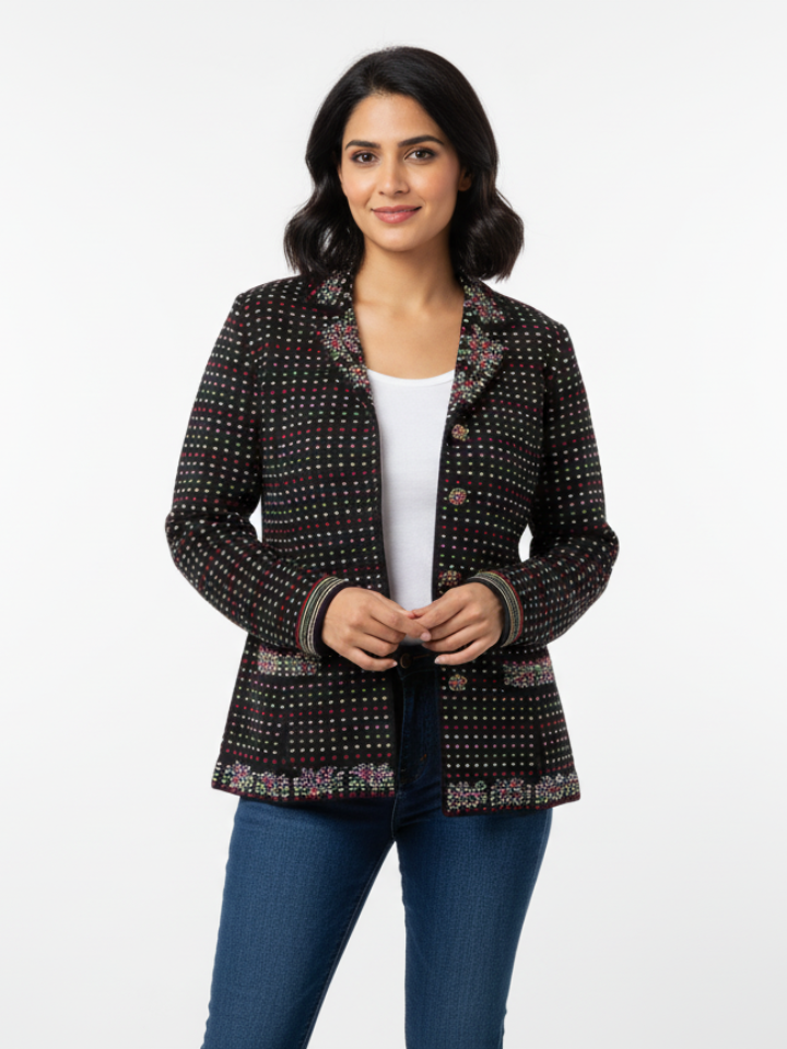 - Intricate Micro-Pattern: The jacket’s body features a complex, small-scale woven or embroidered dot pattern in red, green, and cream/white on a striking black base. This texture gives the fabric a rich, handcrafted appeal.