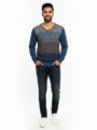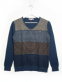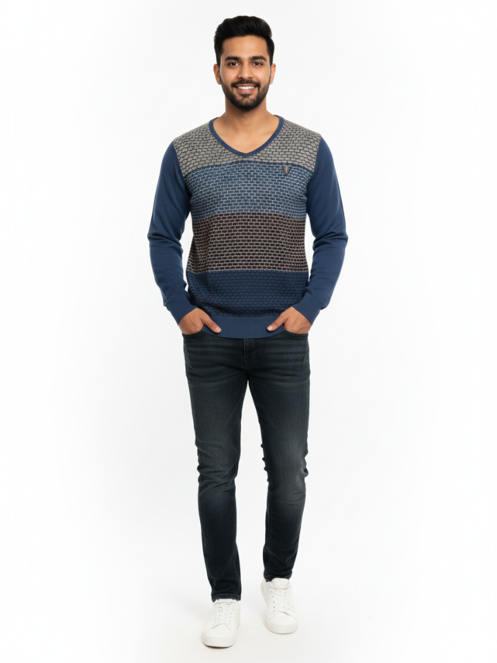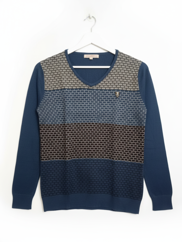 Elevate your cool-weather wardrobe with this stylish and comfortable men’s M-size V-neck sweater. Featuring a modern, multi-textured block pattern in contrasting shades of blue, grey, and black/brown, this sweater is the perfect blend of warmth and contemporary style. The subtle V-neckline makes it ideal for layering over collared shirts or wearing alone for a smart casual look.
