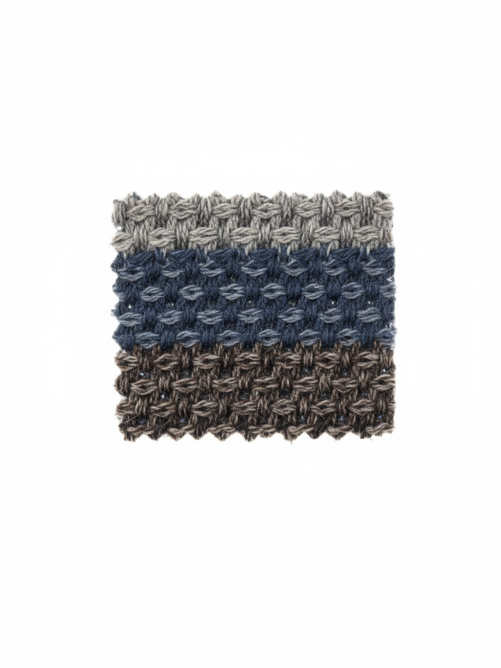 - Pattern: Distinctive horizontal block pattern combining various textured knits (brick-like, ribbed) in multiple colors.