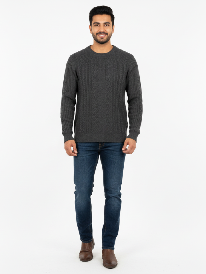 Crafted for comfort and style, this classic charcoal grey sweater features a timeless cable knit pattern, adding texture and sophistication to any look. The generously sized XL fit ensures maximum comfort without sacrificing a smart silhouette. Perfect for layering over a collared shirt or wearing on its own for casual elegance.