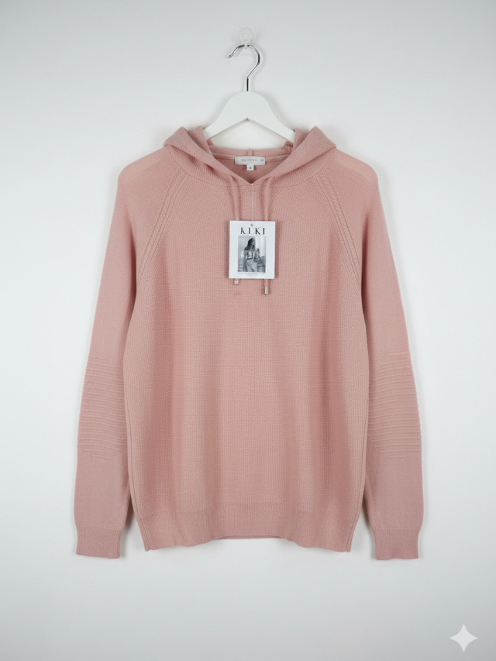 Stay warm and effortlessly chic with this peach hooded women’s sweater from KIKAI. Designed for both comfort and style, this medium-weight knit pullover features a soft textured fabric, a cozy hood with drawstrings, and ribbed sleeve detailing for a trendy touch.
