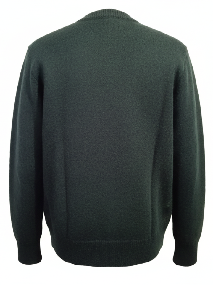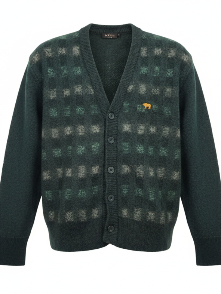 Elevate your everyday look with this charming KIKI cardigan, designed for both comfort and timeless appeal. This M-size sweater features a rich, dark green base adorned with a subtle yet distinctive plaid pattern, adding a touch of sophisticated texture. The front is secured with a row of coordinating buttons, and a small, tasteful animal emblem (looks like a bear/deer) on the chest provides a unique detail.