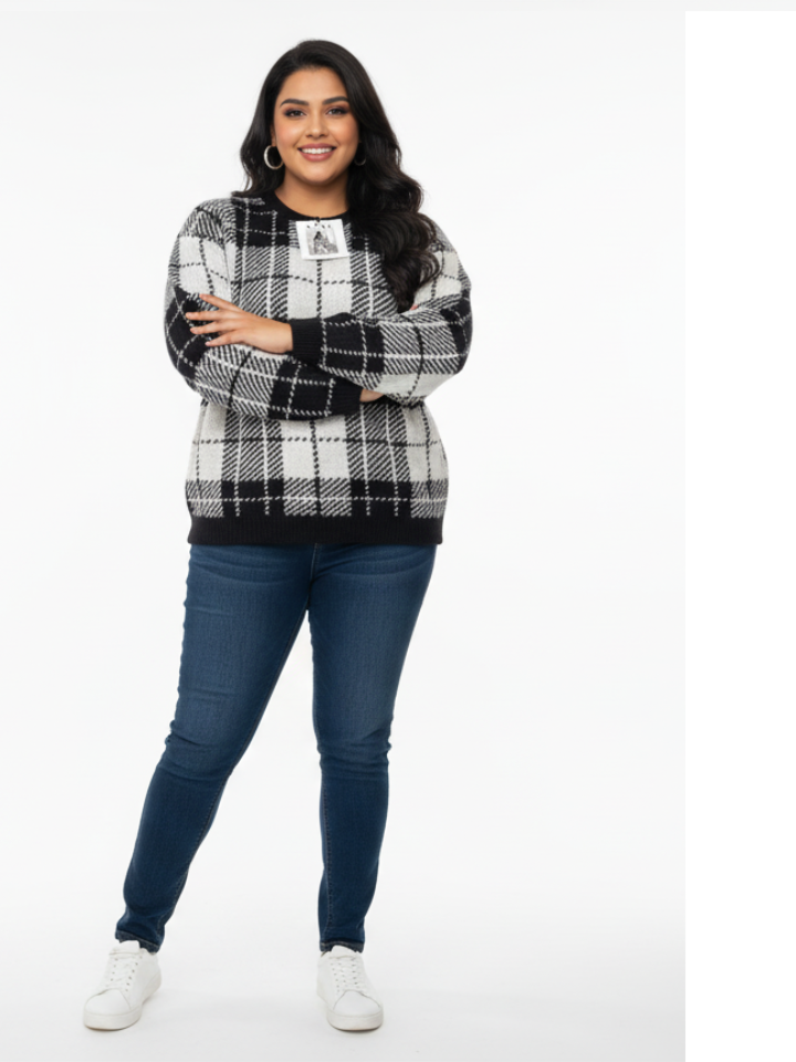 Stay cozy and stylish this season with this black and white checkered women’s sweater from KUKI. Featuring a trendy plaid pattern and made from soft, warm knit fabric, this pullover combines comfort with classic winter fashion. The round neck and ribbed cuffs and hem ensure a perfect fit, making it an ideal choice for chilly days.