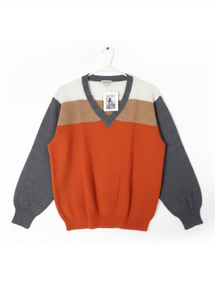 Stay cozy and stylish this winter with this multicolor women’s sweater from KIKAI. Made from soft, warm knit fabric, it features a trendy color-block pattern in orange, beige, white, and grey. The V-neck design and ribbed sleeves give it a modern, flattering look. Perfect for casual wear, office, or travel.