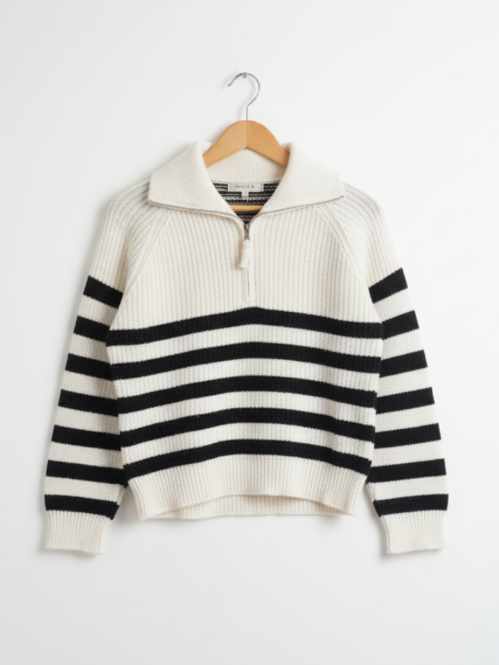 Snuggle up in style this season with our Women’s L-Size Winter Sweater, featuring a classic black and cream stripe design that never goes out of fashion. This versatile knit is the perfect addition to your cold-weather wardrobe, offering both warmth and effortless style.