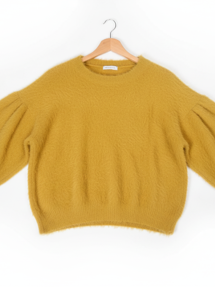 - Style: Crewneck Pullover, Long Lantern Sleeves, Fuzzy/Mohair-Look Knit